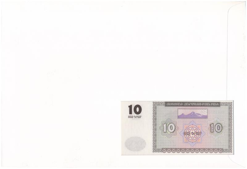 Arm... https://www.darabanth.com/de/435-Fernauktion/435.0/Numismatik/Umschlage-mit-Munzen-und-Banknoten~1000004/Ormenyorszag-1993-10D-felbelyegzett-boritekban-belyegzessel-TI-Armenia-1993-10-Dram-in-~II2776985