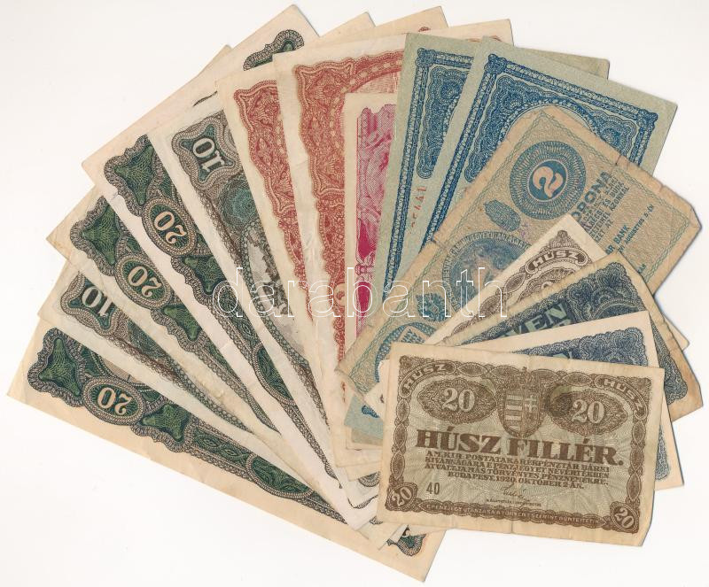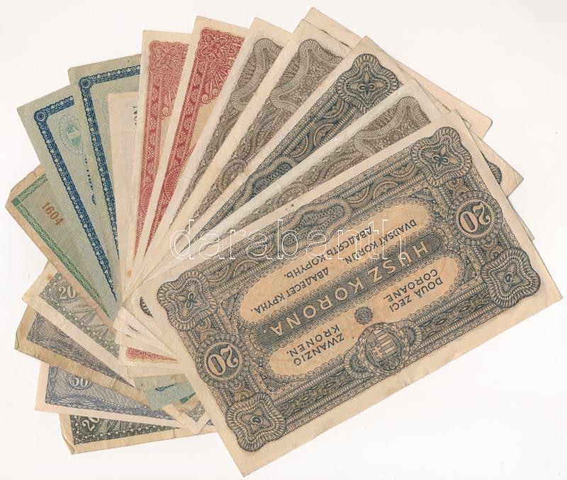15db vegyes korona bankjegy T:II--IV https://www.darabanth.com/de/435-Fernauktion/435.0/Numismatik/Ungarische-Banknoten~1000007/15db-vegyes-korona-bankjegy-TII-IV~II2815966