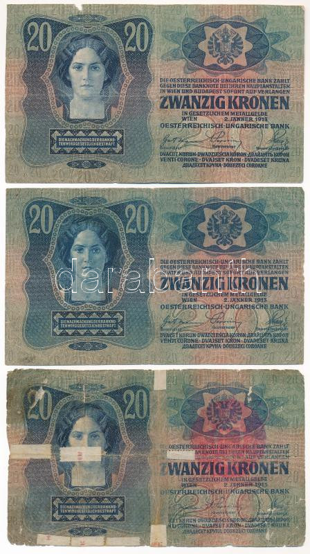 1913. 20K (3db) egyik piros "MAGYARORSZÁG" felülbélyegzéssel... https://www.darabanth.com/de/435-Fernauktion/435.0/Numismatik/Ungarische-Banknoten~1000007/1913-20K-3db-egyik-piros-MAGYARORSZAG-felulbelyegzessel-TIII-IV-egyik-ragasztott-Adamo-K1~II2815040