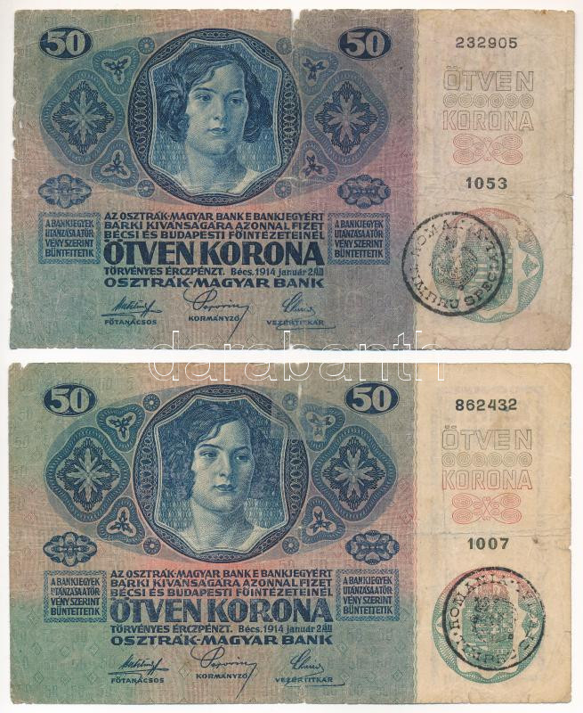 1914. 50K fekete "ROMANIA TIMBRU SPECIAL" felülbélyegzéssel ... https://www.darabanth.com/de/435-Fernauktion/435.0/Numismatik/Ungarische-Banknoten~1000007/1914-50K-fekete-ROMANIA-TIMBRU-SPECIAL-felulbelyegzessel-2db-TIII-egyiken-ragasztas-Hung~II2815041