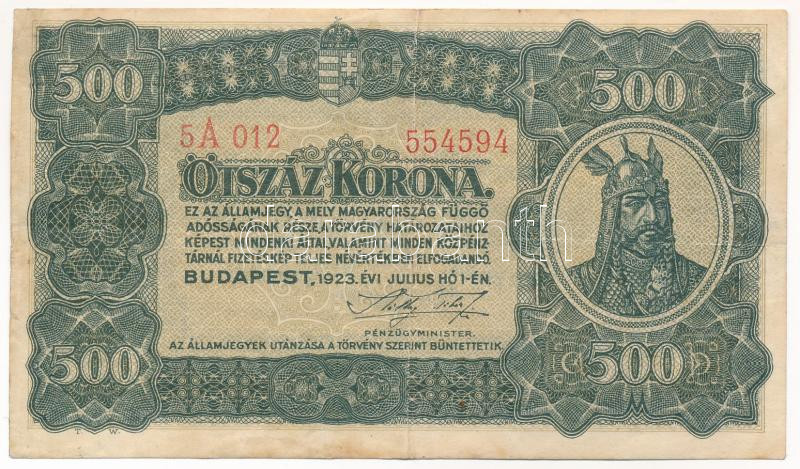 Beschreibung: 1923. 500K "5A 012 554594" nyomdahely jelölés nélkül T:III folt, apró szakadás