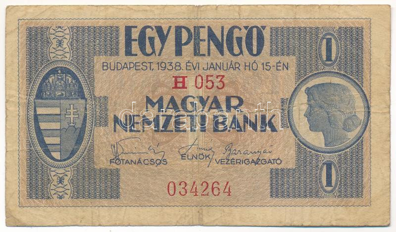 Hungary 193... https://www.darabanth.com/de/435-Fernauktion/435.0/Numismatik/Ungarische-Banknoten~1000007/1938-1P-H-053-034264-TIII-III-kis-szakadas-Hungary-1938-1-Pengo-H-053-034264-CF-VG-small~II2815582