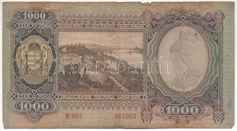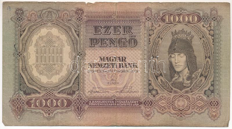 1943. 1000P "F 065 061803" T:III- Adamo P21 https://www.darabanth.com/de/435-Fernauktion/435.0/Numismatik/Ungarische-Banknoten~1000007/1943-1000P-F-065-061803-TIII-Adamo-P21~II2817403