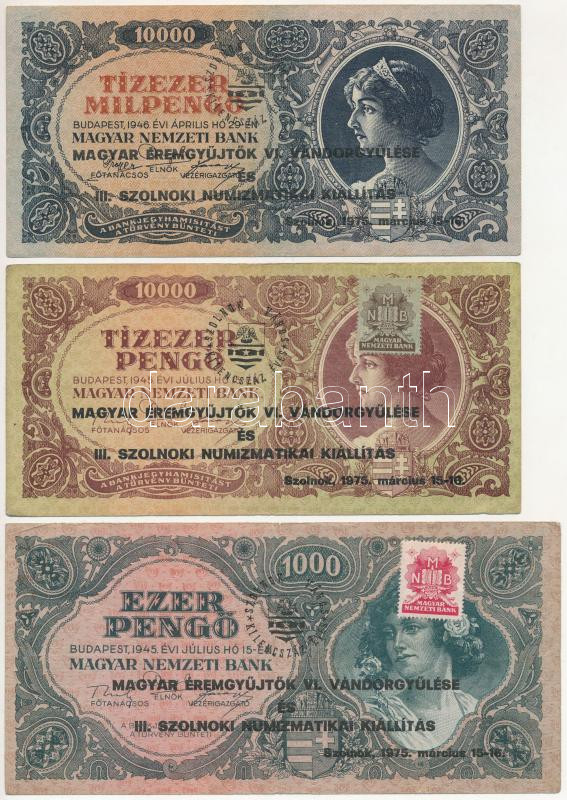 Beschreibung: 1945. 1000P + 1945. 10.000P + 1945. 100.000P + 1945. 10.000.000P + 1946. 10.000MP mind "Magyar Éremgyűjtők VI. vándorgyűlése és III. Szolnoki Numizmatikai Kiállítás" felülbélyegzéssel T:II-III Adamo FO35.3.7, FO35.3.7,9, FO35.3.10, FO35.3.13, FO35.3.15