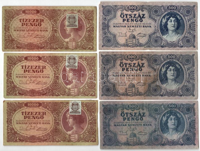 1945. 500P (3x) + 10.000P "MNB" bélyeggel (3x) T:III,III- fo... https://www.darabanth.com/de/435-Fernauktion/435.0/Numismatik/Ungarische-Banknoten~1000007/1945-500P-3x-plus-10000P-MNB-belyeggel-3x-TIII-III-folt~II2816668