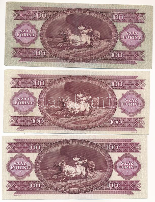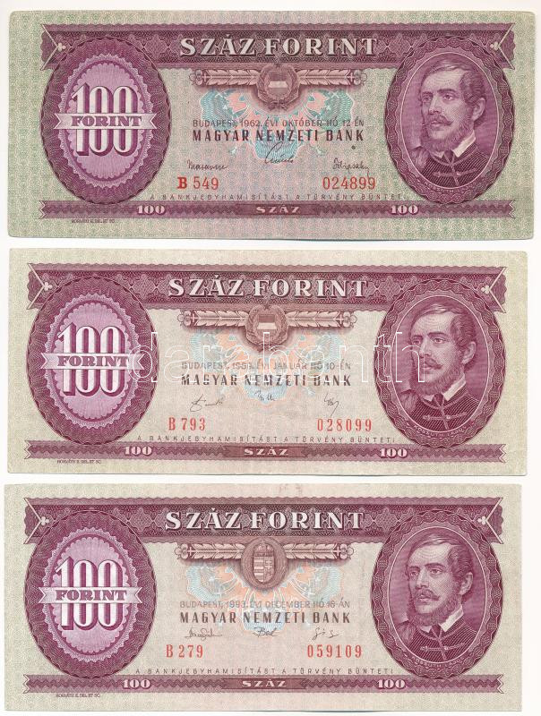 1962. 100Ft + 1989. 100Ft + 1993. 100Ft T:III https://www.darabanth.com/de/435-Fernauktion/435.0/Numismatik/Ungarische-Banknoten~1000007/1962-100Ft-plus-1989-100Ft-plus-1993-100Ft-TIII~II2814899