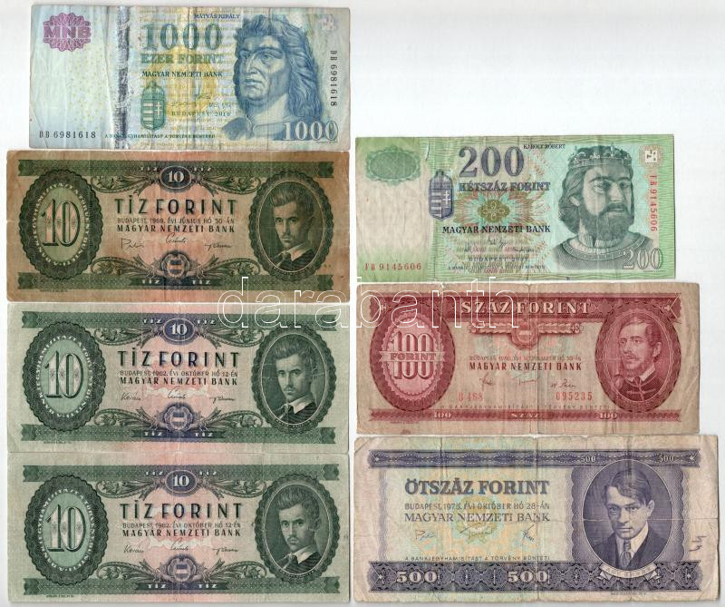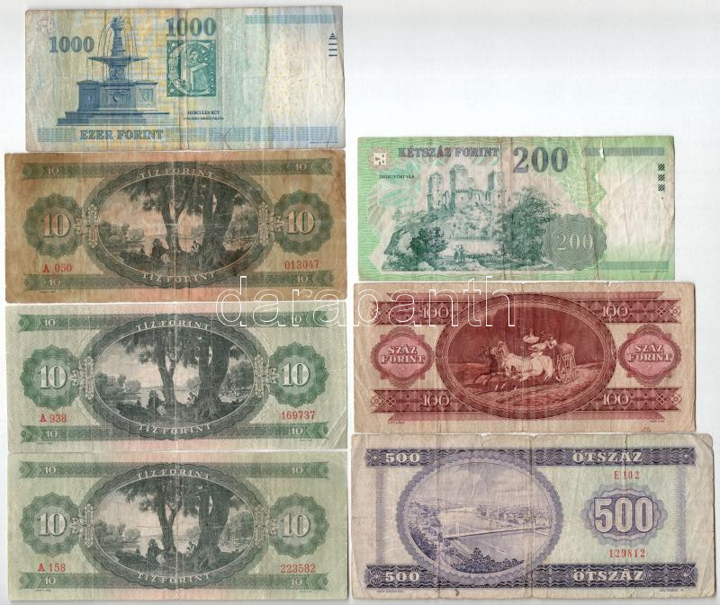 Beschreibung: 1962. 10Ft (2x) + 1969. 10Ft + 1975. 500Ft + 1980. 100Ft + 2007. 200Ft + 2010. 1000Ft T:III- szakadás, folt, az egyiken firka