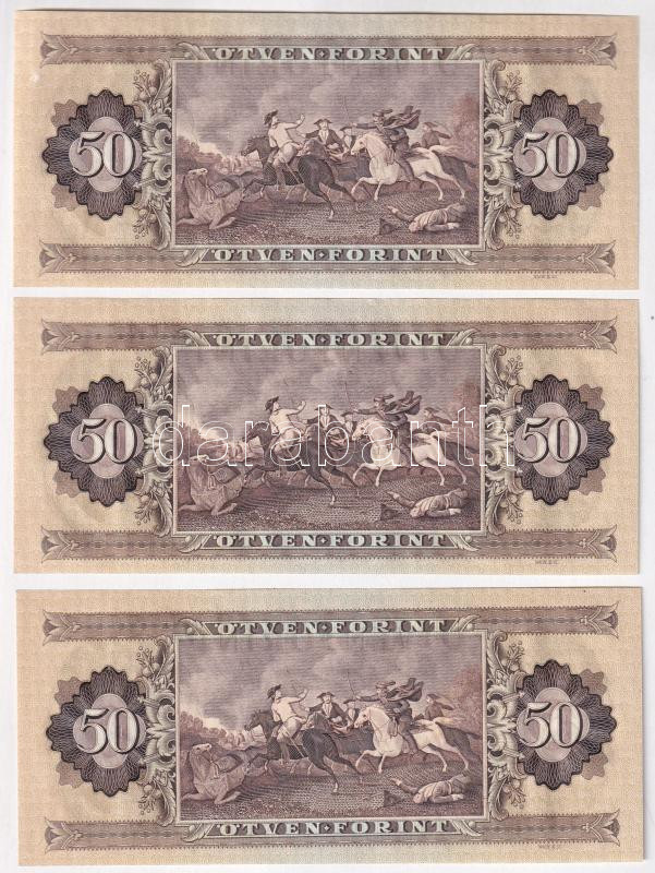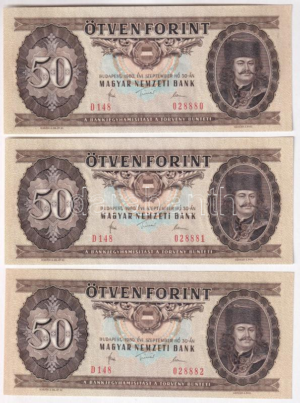 1980. 50Ft (3x) sorszámkövetők "D 148 028880 - D 148 028882"... https://www.darabanth.com/de/435-Fernauktion/435.0/Numismatik/Ungarische-Banknoten~1000007/1980-50Ft-3x-sorszamkovetok-D-148-028880-D-148-028882-TI-hullamos-papir-Adamo-F22~II2816855