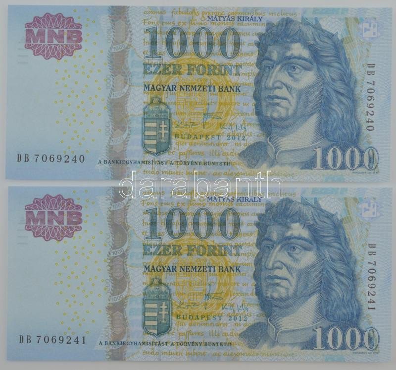 2012. 1000Ft (2x) sorszámkövetők "DB 7069240 - DB 7069241" T... https://www.darabanth.com/de/435-Fernauktion/435.0/Numismatik/Ungarische-Banknoten~1000007/2012-1000Ft-2x-sorszamkovetok-DB-7069240-DB-7069241-TI-Adamo-F55P1~II2807377