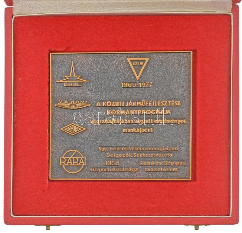 1977. "1969-1977 - A közúti járműfejlesztési kormányprogram végrehajtásában végzett eredményes munkájáért - Vas-, Fém-, és Villamosenergiaipari Dolgozók Szakszervezete - KISZ Központi Bizottsága - Kohó és Gépipari Minisztérium" egyoldalas bronz plakett eredeti tokban (100x88mm) T:1-