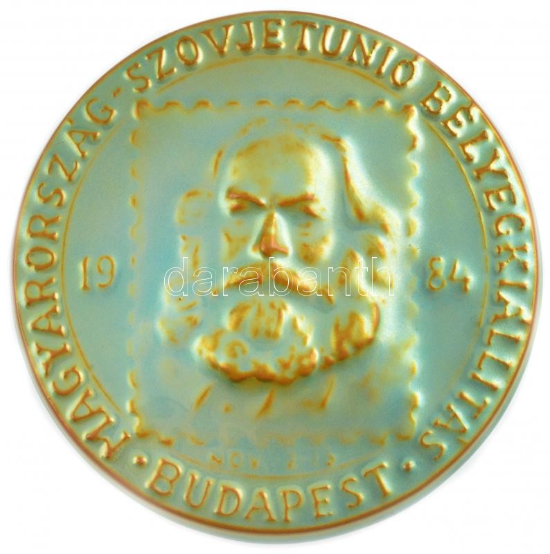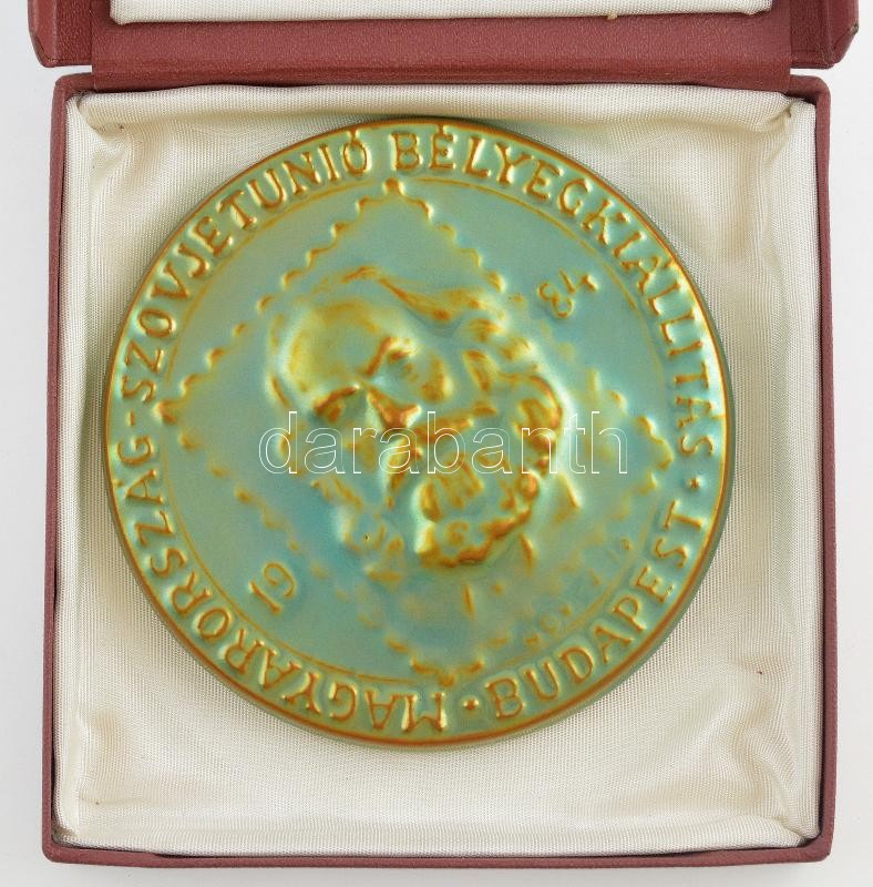 1984. "Magyarország - Szovjetunió Bélyegkiállítás - Budapest 1984" egyoldalas, eozin mázas Zsolnay porcelán emlékplakett, eredeti dobozában (100mm) T:1- hátoldalán pár helyen az eozin máz lekopott / Hungary 1984. "Hungary - Soviet Union Stamp Exhibition - Budapest 1984" one-sided Zsolnay porcelain commemorative plaque with eosin glaze, in its original hardcase (100mm) C:AU the eosin glaze has worn off in a few places on the reverse