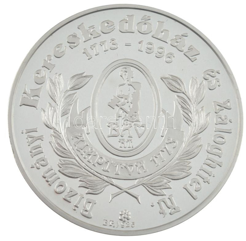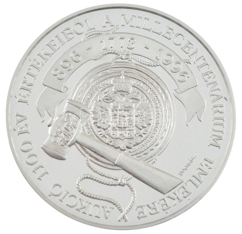 1996. "BÁV Rt. - Bizományi Kereskedőház és Záloghitel Rt / Aukciók 1100 év értékeiből a Millecentenárium emlékére" Ag emlékérem eredeti BÁV műanyag tokban, tanúsítvánnyal (31,104g/0.925/42,5mm) T:PP