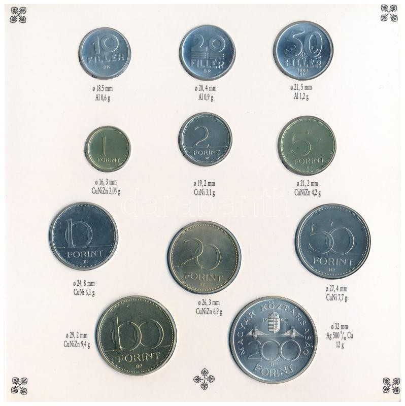 1993. 10f-200Ft (11xklf) forgalmi sor, benne 200Ft Ag "MNB",... https://www.darabanth.com/de/435-Fernauktion/435.0/Numismatik/Ungarische-Munzen-und-Munzen-mit-ungarischem-Munzzeichen~1000008/1993-10f-200Ft-11xklf-forgalmi-sor-benne-200Ft-Ag-MNB-Magyarorszag-penzermei-karton-di~II2795890