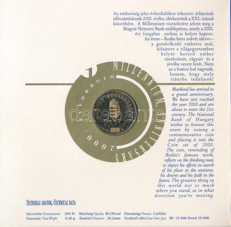 2000. 1Ft-100Ft (7xklf) forgalmi sor szettben + "200Ft Millenium&... https://www.darabanth.com/de/435-Fernauktion/435.0/Numismatik/Ungarische-Munzen-und-Munzen-mit-ungarischem-Munzzeichen~1000008/2000-1Ft-100Ft-7xklf-forgalmi-sor-szettben-plus-200Ft-Millenium-TBU-patina-Adamo-FO33~II2822396