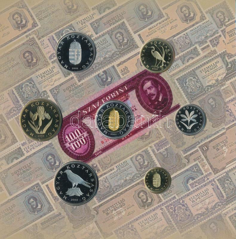 2002. 1Ft-100Ft (7xklf) + 100Ft "Kossuth" forgalmi sor szett... https://www.darabanth.com/de/435-Fernauktion/435.0/Numismatik/Ungarische-Munzen-und-Munzen-mit-ungarischem-Munzzeichen~1000008/2002-1Ft-100Ft-7xklf-plus-100Ft-Kossuth-forgalmi-sor-szettben-TPP-patina-belso-tok-ragasztasa-~II2822394