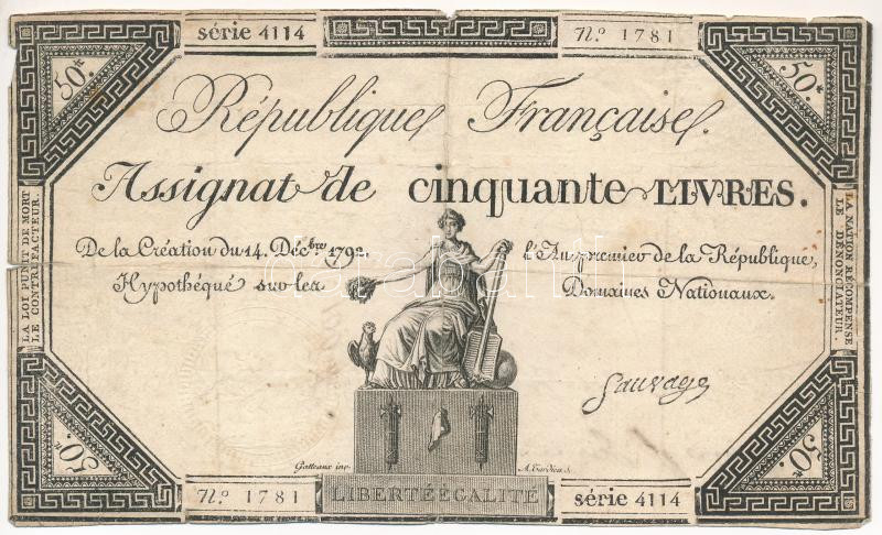 Franciaország 1792. 50L "Assignata" T:III,III- szakadások Fr... https://www.darabanth.com/de/435-Fernauktion/435.0/Numismatik/Weltweit-Banknoten~1500030/Franciaorszag-1792-50L-Assignata-TIII-III-szakadasok-France-1792-50-Livres-Assignata-CF-V~II2820133