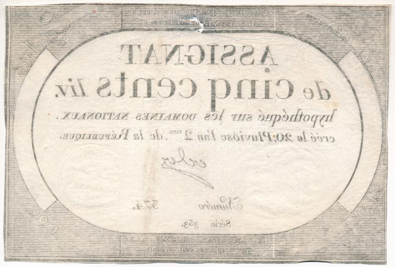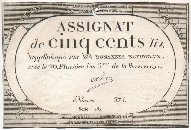 Franciaország 1794. 500L "Assignata" "353 374" T:III,III- középvonalnál fent nagyobb ly.
