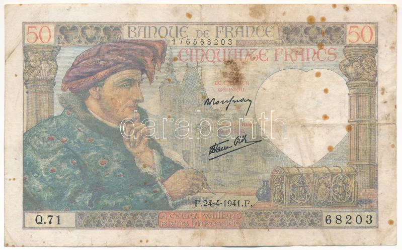 France 1941. 50 Francs C:F spotted... https://www.darabanth.com/de/435-Fernauktion/435.0/Numismatik/Weltweit-Banknoten~1500030/Franciaorszag-1941-50Fr-TIII-fo-France-1941-50-Francs-CF-spotted-Krause-P2393~II2820460