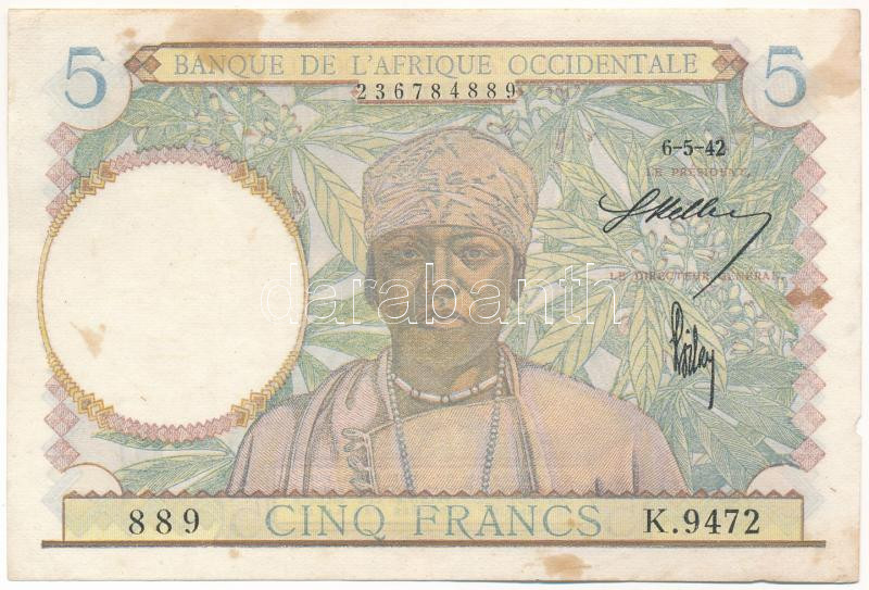 Franciaország 1942. 5Fr "889 K.9472" T:II,II- fo., kis anyaghiány