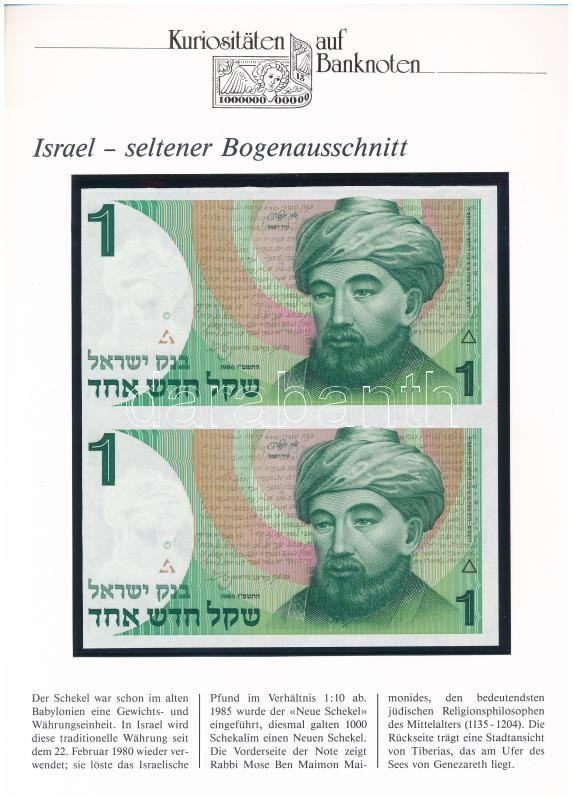 Izrael 1986. 1Sh (2x) összefüggésben, német nyelvű "Kuriositäten auf Banknoten" tájékoztatólappal T:I