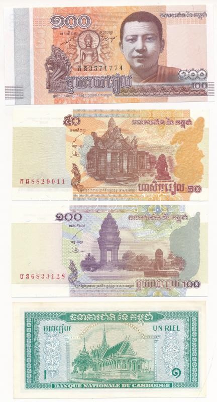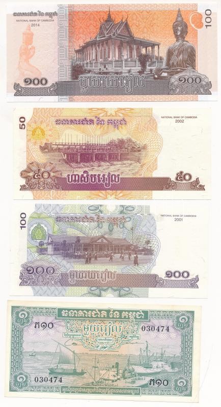 Cambodia ND (1972) 1 Riel + 2001. 100 Riels + 2002. 50 Riels + 2014. 100 Riels C:UNC,AU