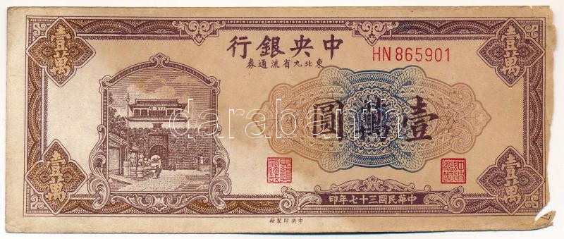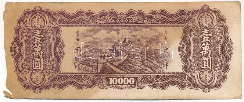 Kína 1948. 10.000Y "HN 865901" T:III,III- folt, kis szakadás, anyaghiány