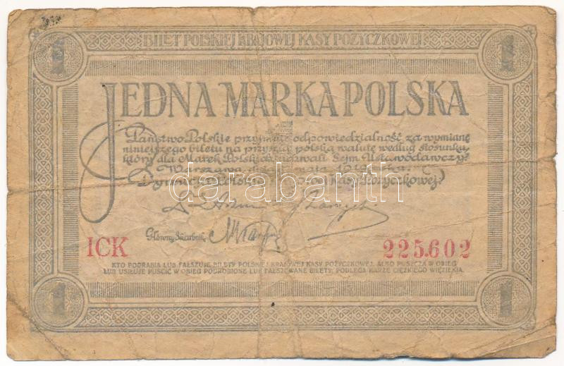 Krause P#19 https://www.darabanth.com/de/435-Fernauktion/435.0/Numismatik/Weltweit-Banknoten~1500030/Lengyelorszag-1919-1M-TIII--Poland-1919-1-Marka-CVG-Krause-P2319~II2820301