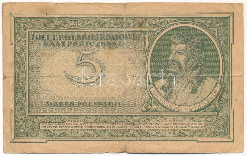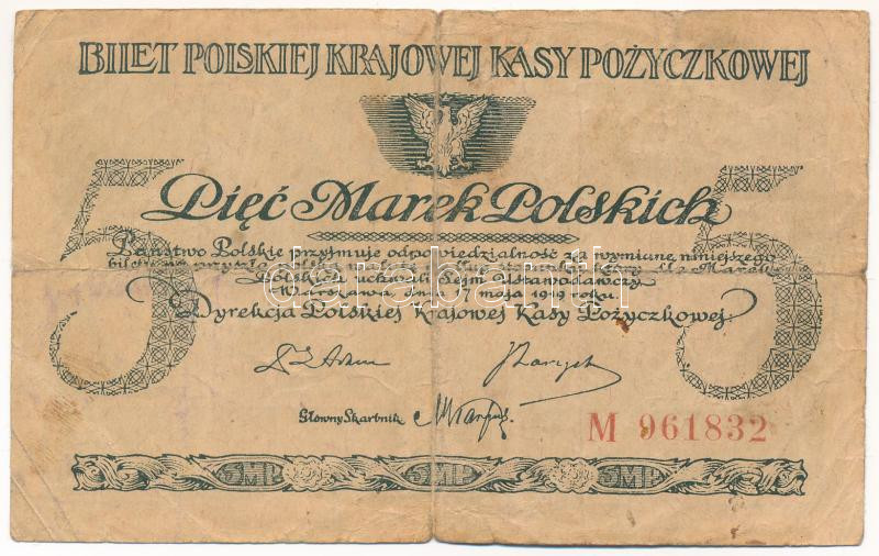 Krause P#20 https://www.darabanth.com/de/435-Fernauktion/435.0/Numismatik/Weltweit-Banknoten~1500030/Lengyelorszag-1919-5M-TIII--Poland-1919-5-Marek-CVG-Krause-P2320~II2820294