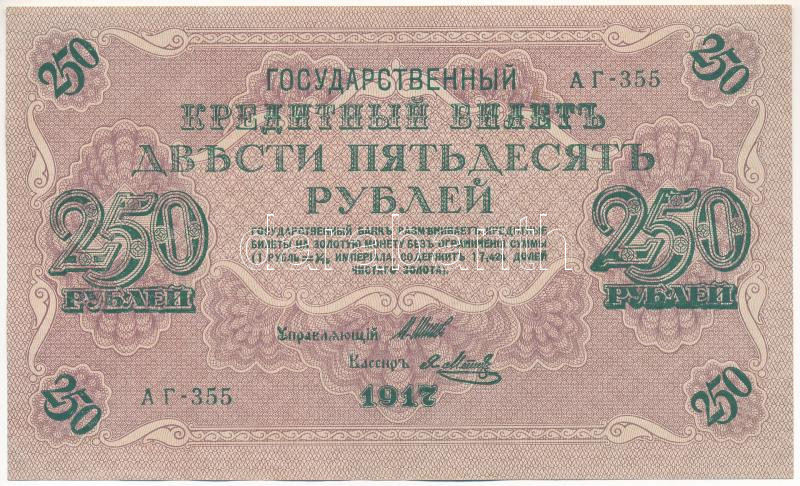 Russian Empire 1917.... https://www.darabanth.com/de/435-Fernauktion/435.0/Numismatik/Weltweit-Banknoten~1500030/Orosz-Birodalom-1917-250R-Szign-Shipov-TII--Russian-Empire-1917-250-Rubles-Szign-Shipov-C~II2820543