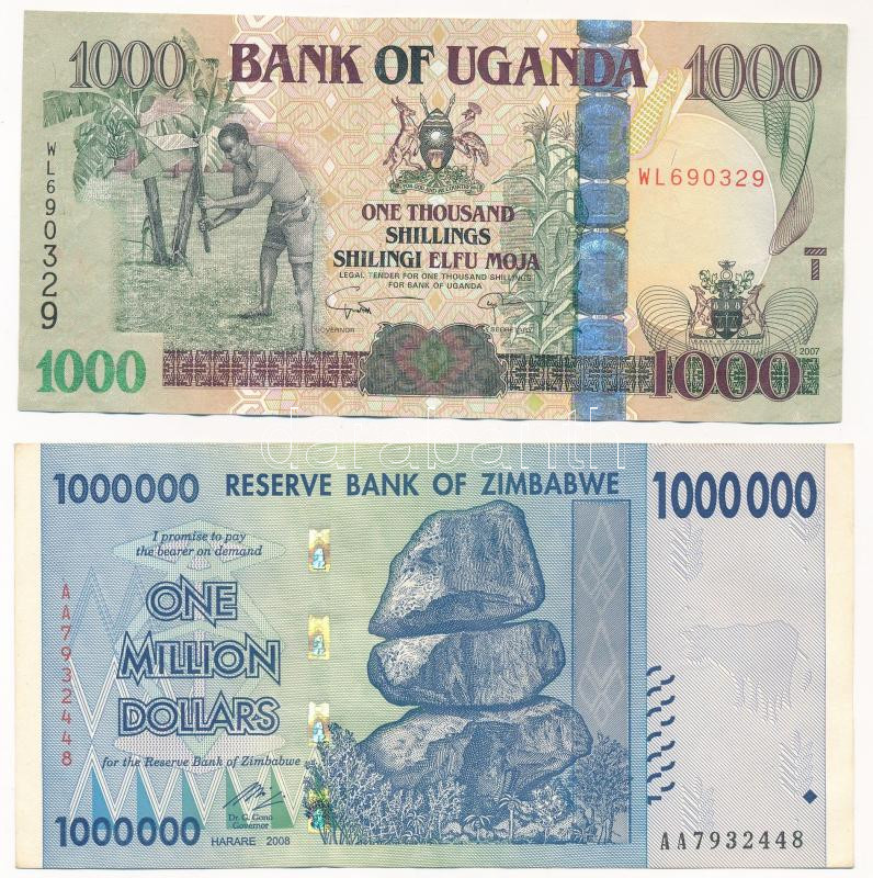 Turkmenistan 1993. 1 Manat + Romania 1998. 5000 Lei + Tanzania 2003. 500 Shiling + Uganda 2007. 1000 Shilling + Zimbabwe 2008. 1.000.000 Dollars C:F fine paper