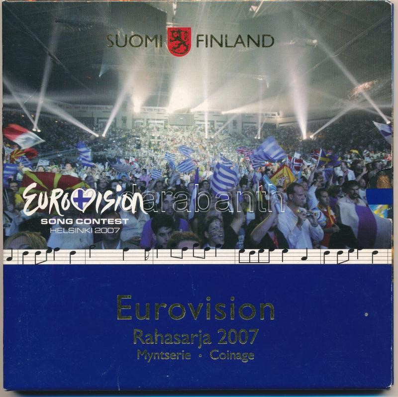 Finland 2007. 1 Cent - 2 Euros (8xdiff) coin set in cardboard display case + "EUROVISION SONG CONTEST HELSINKI 2007" Cu-Ni mint jeton C:UNC,AU