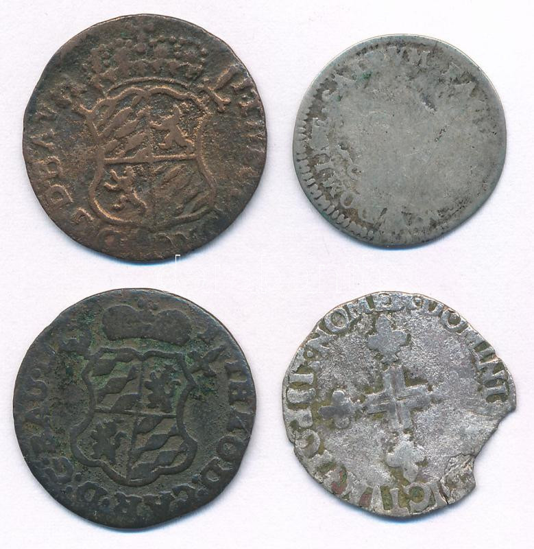 Franciaország 1578-1590. 2S billon "III. Henrik" (1,39g) + 1691V 4S Ag "XIV. Lajos" Troyes (26,5g) + Liege 1744. 1L Cu "Bajor János Teodor" + 1750. 1L Cu "Bajor János Teodor" T:2- - 3- anyaghiány, hajlott France 1578-1590. 2 Sol billon "Henry III" (1,39g) + 1691V 4 Sol Ag "Louis XIV" Troyes (26,5g) + Liege 1744. 1 Liard "John Theodore of Bavaria" + 1750. 1 Liard "John Theodore of Bavaria" C:VF-VG material error, curved Krause KM#146, 155, 281