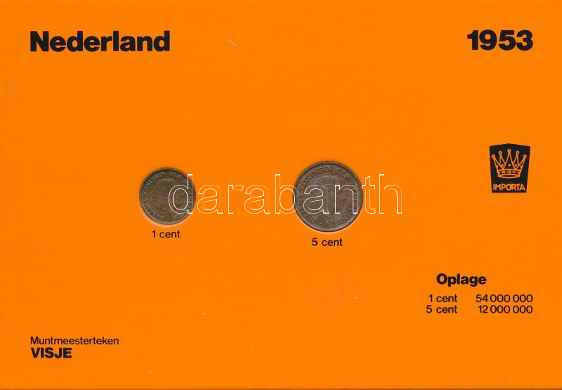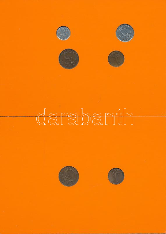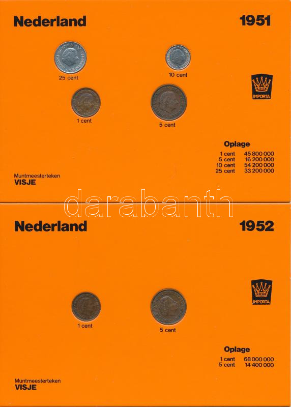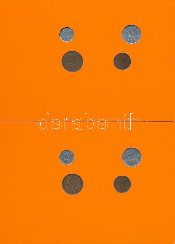 Hollandia 1948-1953. 1c-25c öt különböző év nem hivatalos forgalmi összeállításai narancssárga kartonlapon, összesen 16xklf érmével T:2,2- Netherlands 1948-1953. 1 Cent - 25 Cent unofficial coin sets from five different years on orange cardboard, 16xdiff coins C:XF,VF