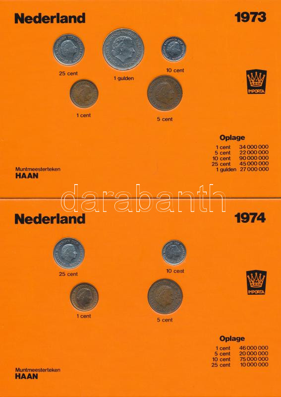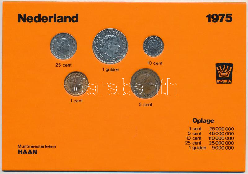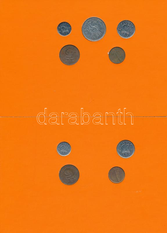 Hollandia 1971-1975. 1c-2 1/2G öt különböző év nem hivatalos forgalmi összeállítása, narancssárga kartonlapon, összesen 26xklf érmével T:1--2- Netherlands 1971-1975. 1 Cent - 2 1/2 Gulden five unofficial coin sets from different years on orange cardboard, 26xdiff coins C:AU-VF