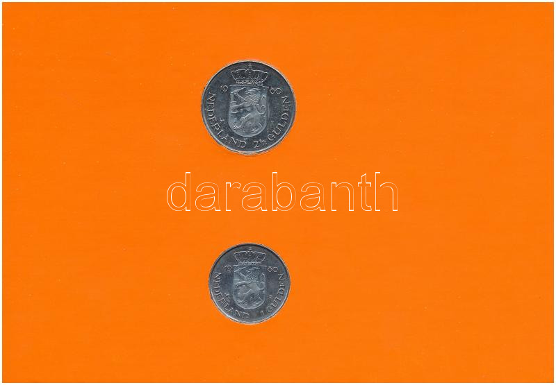 Hollandia 1980. 1G Ni + 2 1/2G Ni "Az új királynő beiktatása" forgalmi emlékérmék narancssárga karton díszlapon T:1-,2 Netherlands 1980. 1 Gulden Ni + 2 1/2 Gulden Ni "Investiture of New Queen" circulating commemorative coins on orange cardboard C:AU,XF