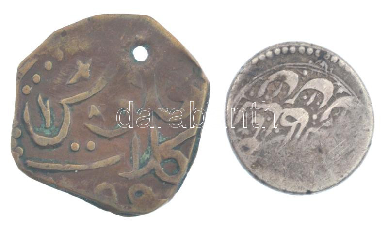 Irán (Perzsia) 1865. (1281.) 1Q Ag (4,90g) + Indiai Államok(?) Cu érme (2,51g) ly. T:2- Iran (Persia) 1865. (1281.) 1 Qiran Ag (4,90g) + Indian States(?) Cu coin (2,51g) holed C:VF Krause KM#824