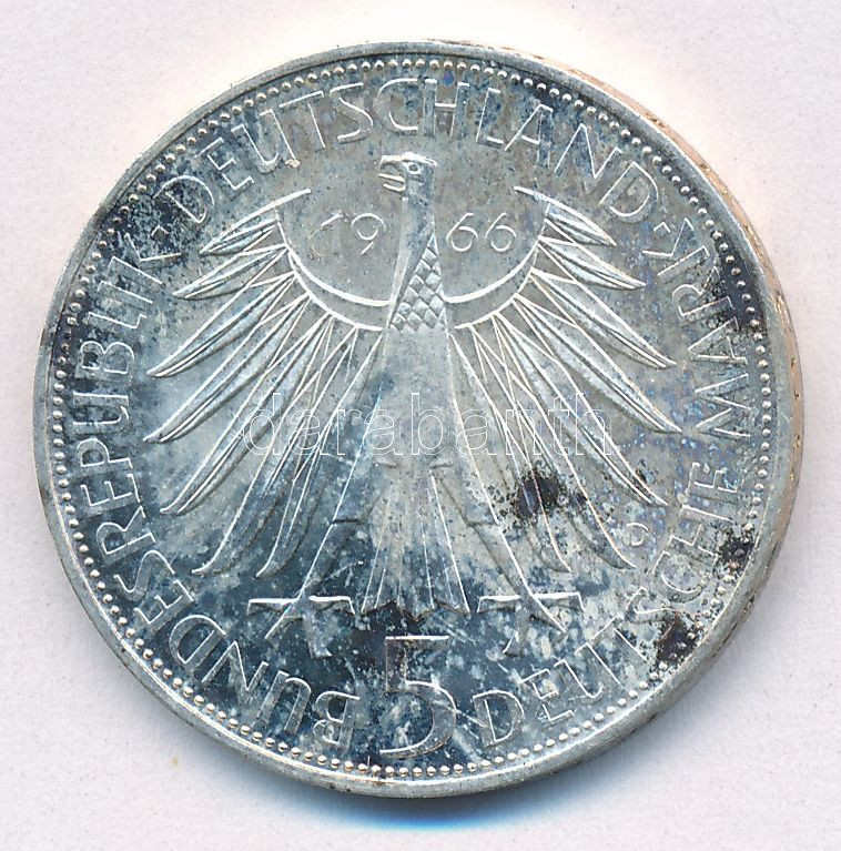 NSZK 1966D 5M Ag "Wilhelm Leibniz" T:1 patina FRG 1966D 5 Mark Ag "Wilhelm Leibniz" C:UNC patina Krause KM#119