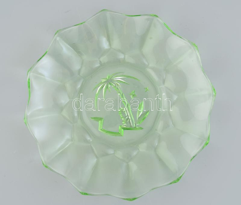 Beschreibung: Zöld uránüveg tálka, rajta pálmafával, karcos, d: 16 cm