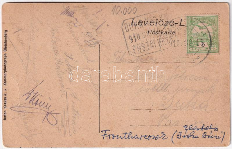 1910 Badafalva, Weichselbaum; Erinnerung an die Fahnenweihe des neugegründeten Ungarischen Militär-Veteranen-Vereins am 14. August 1910. Antos Krauss / Megemlékezés az újonnan alakult Magyar Katonai Veterán Szövetség zászlajának felszenteléséről, kakastollas csendőrök / Commemoration of the dedication of the flag of the newly founded Hungarian Military Veterans Association, gendarme (kopott sarkak / worn corners)