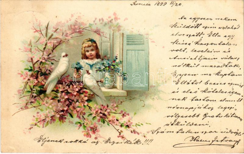 1899 (Vorläufer) Greeting card with girl, doves and flowers. Floral, l... https://www.darabanth.com/de/436-Fernauktion/436.0/Ansichtskarten/GruC39Fkarten-Feste~2000065/1899-Vorlaufer-Greeting-card-with-girl-doves-and-flowers-Floral-litho-kis-szakadas-small-t~II2791200