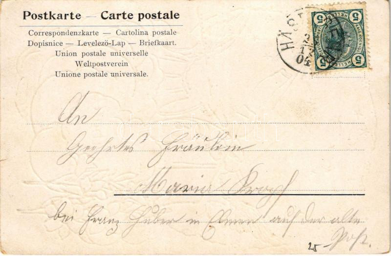 Beschreibung: 1904 Fröhliche Weihnachten! / Christmas greeting art postcard with angels. Art Nouveau, Floral, Emb. litho (kis szakadás / small tear)