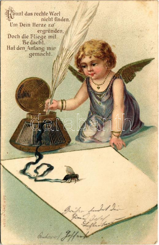 1905 Konnt das rechte Wort nicht finden... / Greeting art postcard wit... https://www.darabanth.com/de/436-Fernauktion/436.0/Ansichtskarten/GruC39Fkarten-Feste~2000065/1905-Konnt-das-rechte-Wort-nicht-finden-Greeting-art-postcard-with-angel-Emb-litho-kis-szaka~II2836976