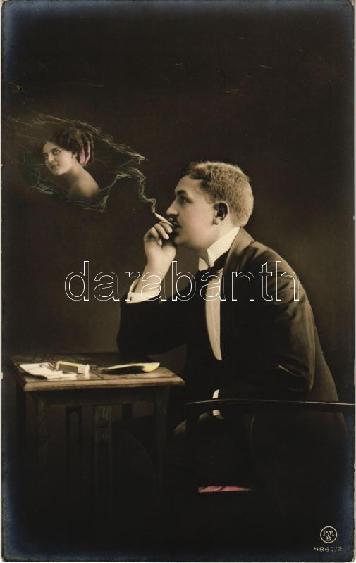 1911 Szerelmes üdvözlőlap, cigarettafüstben megjelenő hölgy / Love gre... https://www.darabanth.com/de/436-Fernauktion/436.0/Ansichtskarten/GruC39Fkarten-Feste~2000065/1911-Szerelmes-udvozlolap-cigarettafustben-megjeleno-holgy-Love-greeting-lady-in-cigarette~II2835824