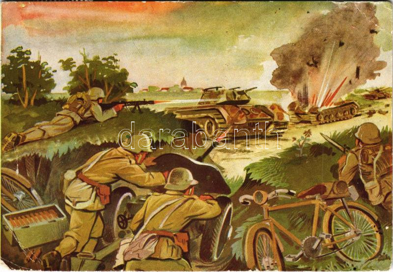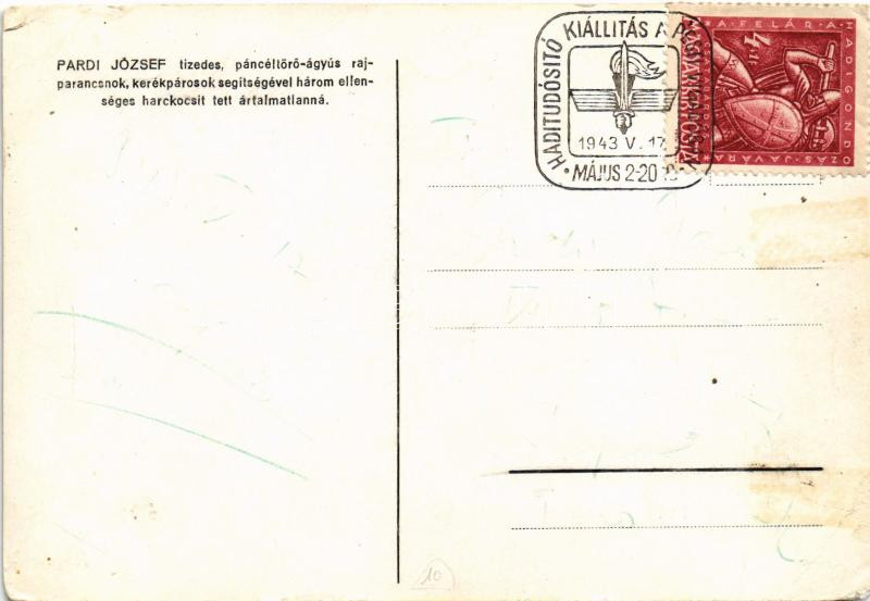 Pardi József tizedes, páncéltörő-ágyús rajparancsnok, kerékpárosok segítségével három ellenséges harckocsit tett ártalmatlanná / WWII Hungarian military art postcard + "Haditudósító Kiállítás Nagyvárad 1943" So. Stpl. (EB)