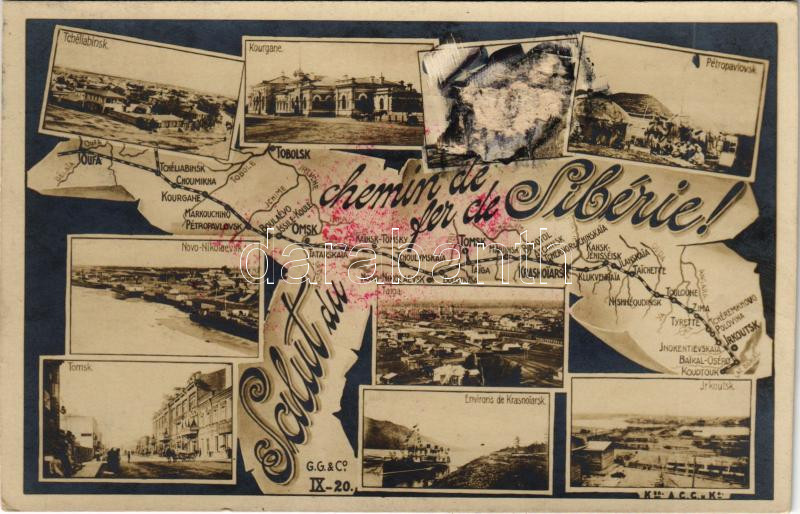 1915 Trans-Siberian Railway Network, Chemin de fer de Sibérie; Transzszibériai vasúthálózat vasútállomásai, térképes montázs. Francia nyelvű hadifogoly képeslap / railway stations, map montage. French edition, POW postcard