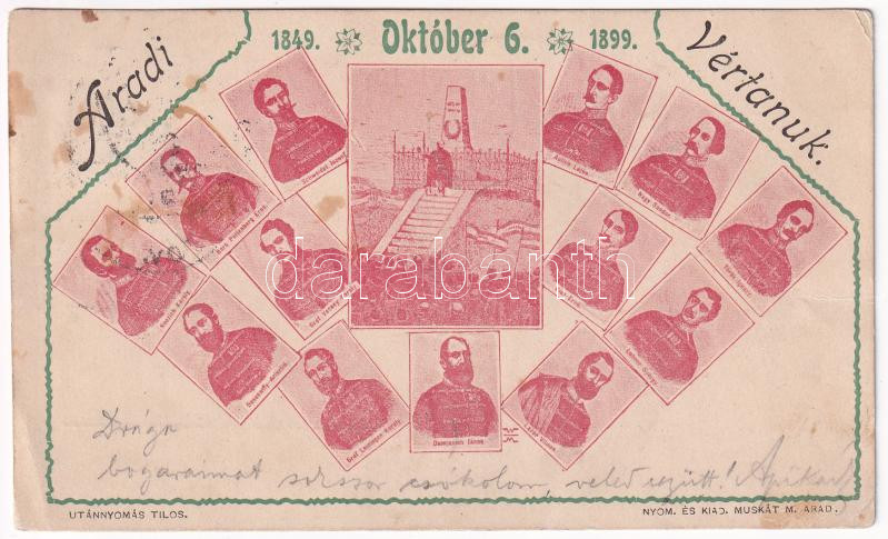 1899 (Vorläufer) Arad, 1849-1899 Október 6. Aradi Vértanúk. Muskát M. ... https://www.darabanth.com/de/436-Fernauktion/436.0/Ansichtskarten/Siebenburgen~2000005/1899-Vorlaufer-Arad-1849-1899-Oktober-6-Aradi-Vertanuk-Muskat-M-kiadasa-The-13-Martyrs~II2836215