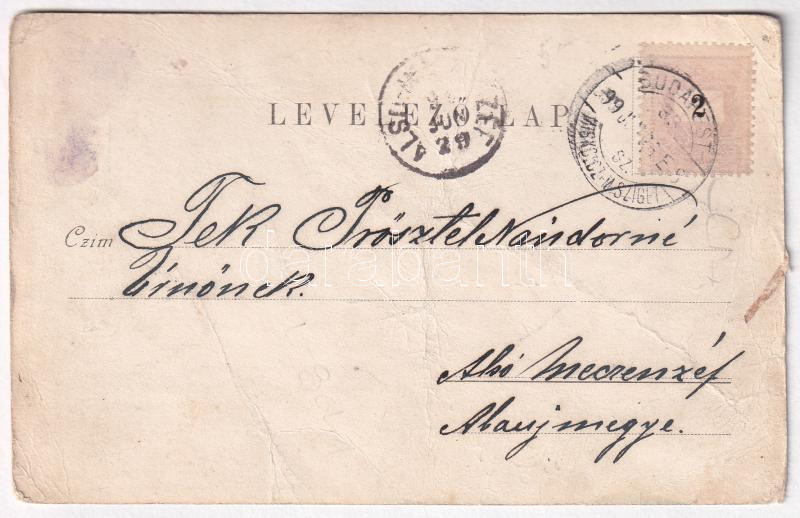 Beschreibung: 1899 (Vorläufer) Máramarossziget, Sighetu Marmatiei; Makerlói vízfogó, gát, tutajos oroszok / Macarlau dam, Russian rafters. Art Nouveau, floral + "BUDAPEST-MISKOLCZ-M. SZIGET 33." vasúti mozgóposta (gyűrődések / crease)