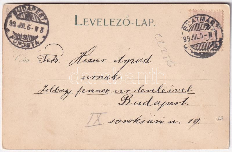 1899 (Vorläufer) Szatmárnémeti, Satu Mare; Közlekedési híd, székesegyház. Reizer János kiadása / bridge, cathedral. Art Nouveau, floral (lyukak / pinholes)