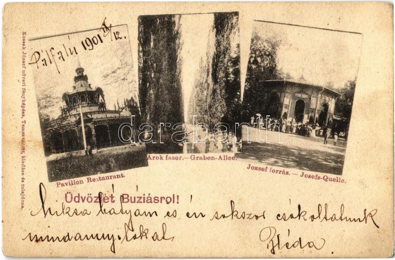 1901 Buziásfürdő, Baile Buzias; Pavillon Restaurant, Graben-Allee, Josefs-Quelle / Étterem, Árok fasor, József forrás. Kiadja Kossak József udvari fényképész / restaurant, alley, thermal spring (Rb)