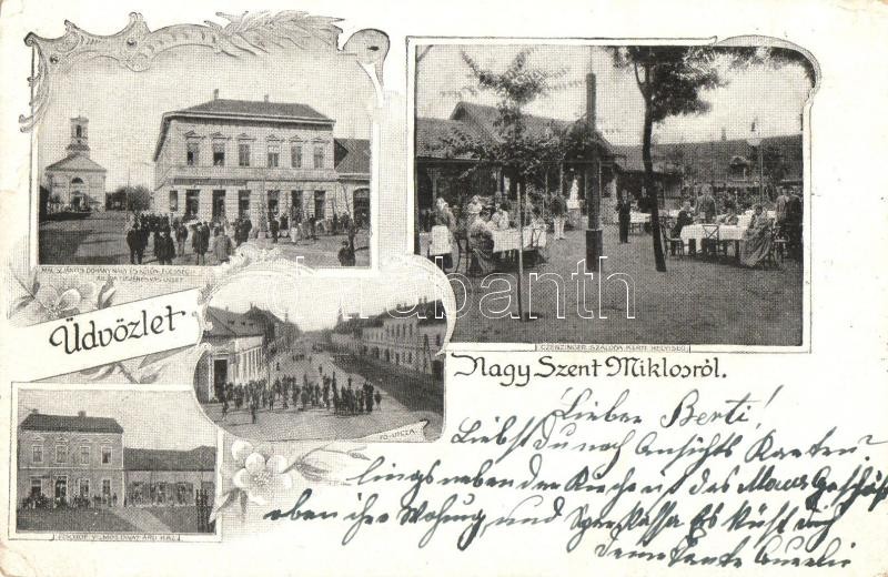 1902 Nagyszentmiklós, Sannicolau Mare; Czenczinger szálloda kerthelyisége, Fő utca, Fischof Vilmos divatáruháza, Mausz János dohány és fűszerüzlete / hotel garden, main street, shops. Art Nouveau, floral (kis szakadás / small tear)
